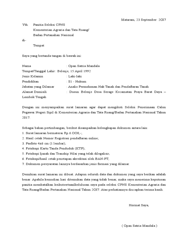 Pendaftaran dibuka secara online melalui website kementerian agraria dan tata ruang badan pertanahan nasional https. Contoh surat lamaran kerja kementerian agraria. Dalam surat lamaran yang dibuat, sebaiknya sobat pun menguraikan pencapaian kerja yang telah dicapai pada perusahaan terdahulu.