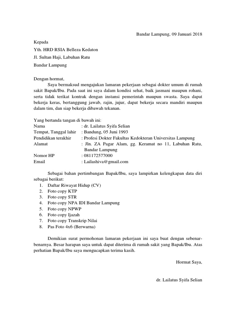 Tetapi, pastikan untuk menggunakan bahasa yang sopan dan tidak arogan. Surat menambahkan lebih banyak kepribadian ke lamaran Anda dengan memberikan lebih banyak detail tentang latar belakang dan minat Anda pada posisi tersebut, sementara resume. Kop surat dan alamat perusahaan Contoh Surat Lamaran Kerja Umum - Setelah menyelesaikan pendidikan tentu setiap orang berharap mendapatkan pekerjaan yang baik di perusahaan impian mereka.