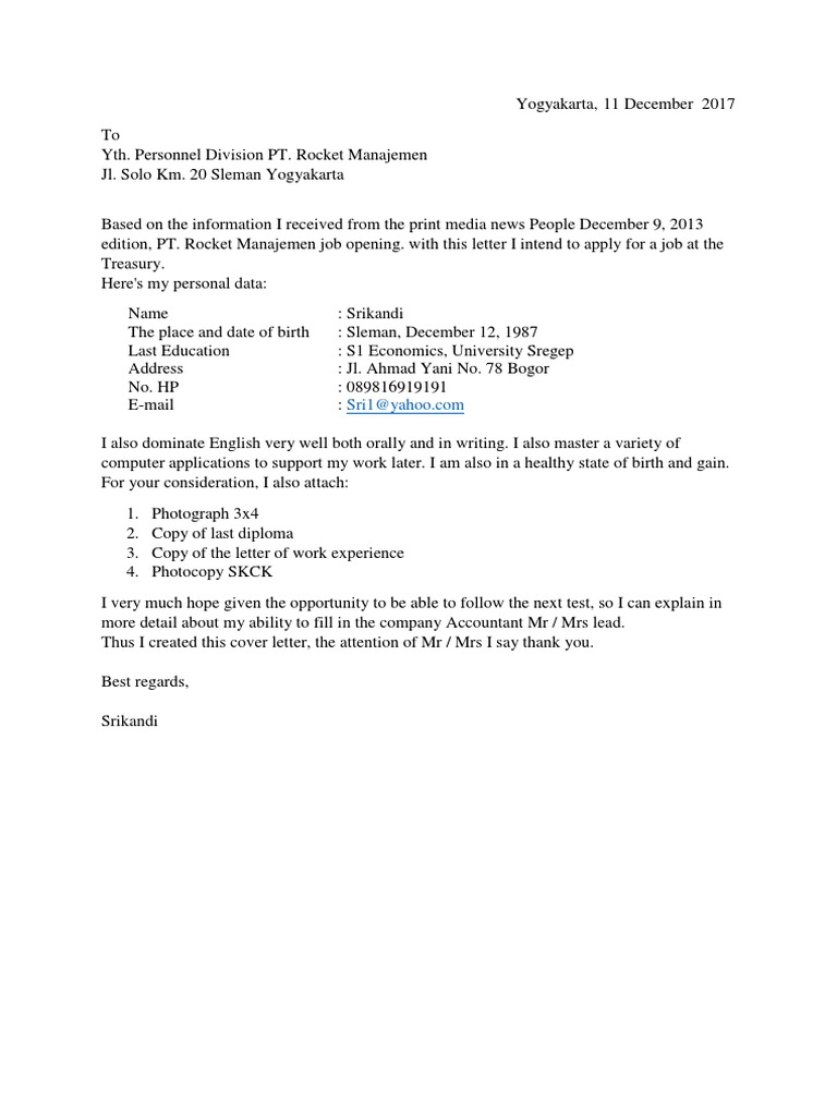 Pada surat lamaran kerja kebanyakan, beberapa informasi yang harus Anda cantumkan contohnya seperti nama, kontak yang bisa dihubungi, dan. Bagian ini berfungsi agar surat lamaran tersebut jelas ditujukan kepada siapa. Lamaran kerja bahasa inggris juga harus menggunakan style yang formal.
