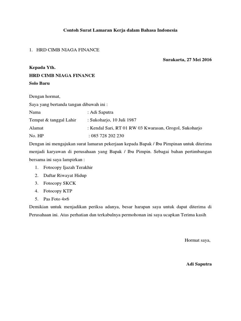 Seperti kita tahu, angka tunakarya setiap waktunya akan senantiasa meningkat. Contoh Surat Lamaran Kerja Indomaret Sebagai Posisi Crew Store. Contoh Surat Lamaran Kerja Indomaret adalah merupakan postingan yang akan saya bahas pada kesempatan yang berbahagia ini untuk kamu para pengunjung setia semuanya, khususnya bagi kamu yang ingin melamar pekerjaan di Indomaret.