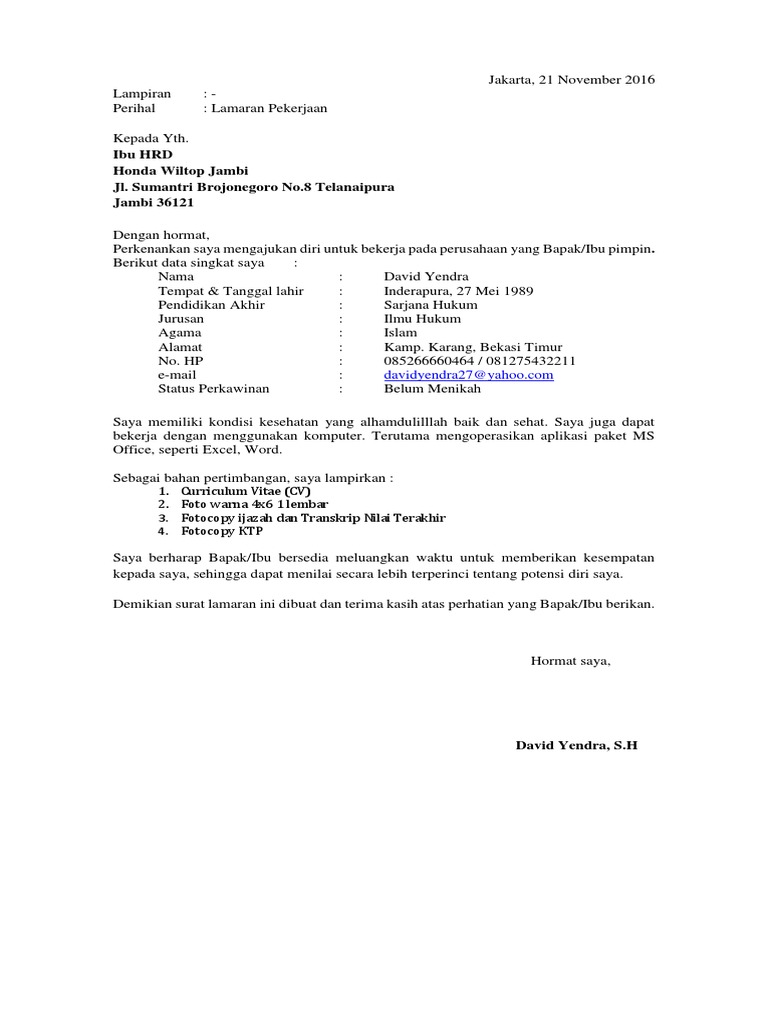 Contoh surat lamaran kerja di pt honda prospect motor. contoh surat lamaran kerja di pt honda prospect motor. lamaran pt hpm Lihat juga contoh soal: lamaran serta latihan materi contoh surat lamaran kerja pt hpm PT. Berikut ini Contoh Surat Lamaran Kerja yang baik dan benar serta menarik perhatian yang dapat anda gunakan dalam tema maupun format penulisan surat. Dapatkan informasi lengkap seputar mobil Honda terbaru disini.