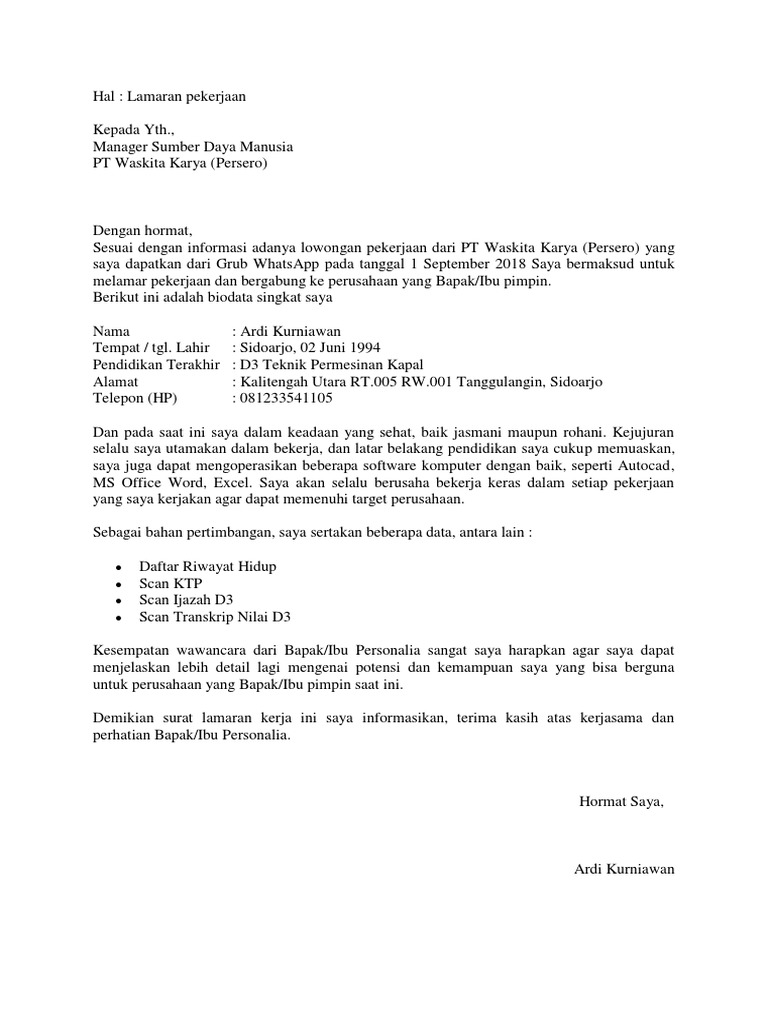 Contoh Surat Lamaran Kerja Account Manager. SEMEN GRESIK Di Tempat Dengan hormat, Sehubungan dengan informasi adanya lowongan kerja di PT. Penulisan Surat Lamaran Kerja Blog ini berisi kumpulan contoh surat lamaran kerja beserta tip & trik dalam menghadapi wawancara kerja..