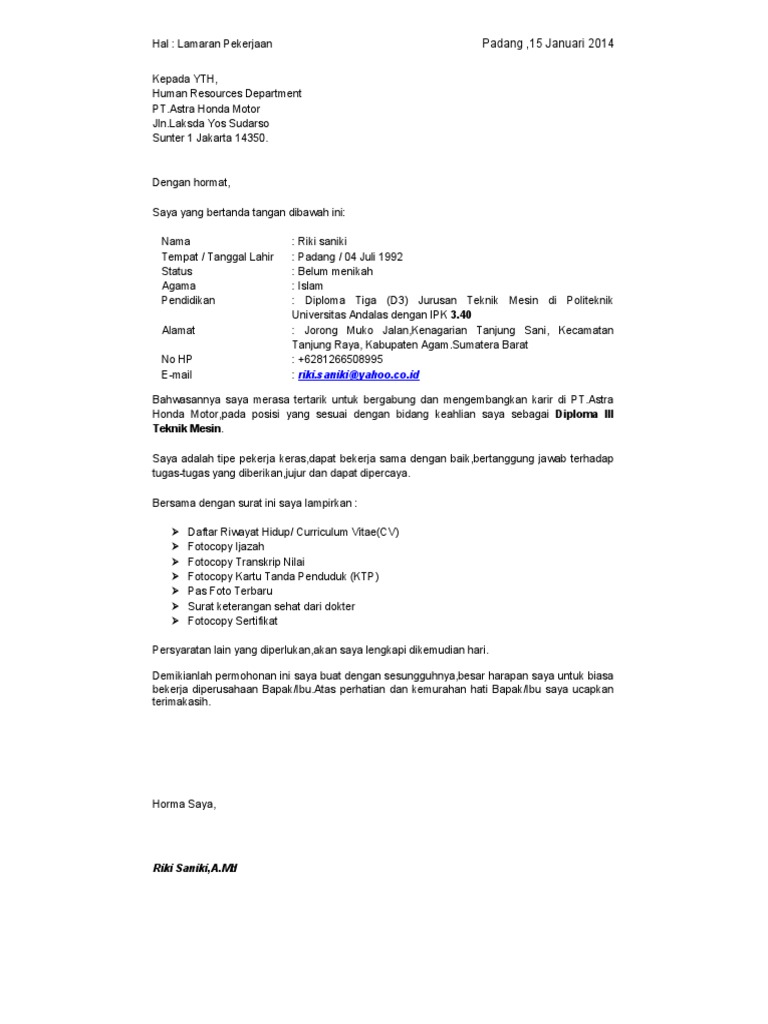 Dealer Motor yang sering membuka lowongan kerja adalah Dealer Motor Honda (Astra Honda, Honda Jaya, CM Honda dan lain sebagainya) serta Dealer Motor Yamaha (Yamaha Mataram Sakti, Yamaha Jaya). Contoh surat lamaran kerja astra honda motor contoh surat lowongan kerja di astra group salah satu tempat kerja yang selalu menjadi favorit dan incaran banyak orang setiap tahunnya adalah pt. Sebagai bahan pertimbangan, berikut saya lampirkan: Curriculum Vitae.