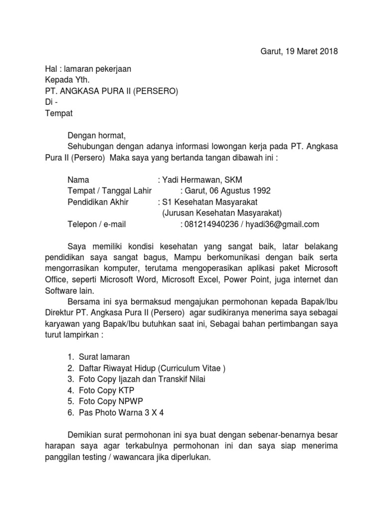 Format dari contoh surat lamaran kerja sangat mempengaruhi diterima tidaknya kita ketika sedang melamar di perusahaan. Contoh Surat Lamaran Kerja Avsec Bandara - Surat lamaran kerja angkasa pura secara umum memiliki format yang sama dengan surat lamaran pekerjaan lainnya. Bisa diperkirakan, amat banyak calon karyawan anyar tiap musimnya.