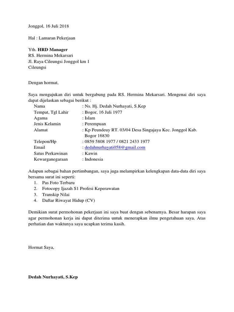 Penghasilan berupa uang bisa didapatkan dengan cara bekerja dan berbisnis. HRD Manager PT Berkas Jaya Grup Jl. Gunakanlah bahasa Indonesia yang baik dan benar, tulis dengan singkat dan sopan, serta pastikan tujuan surat lamaran sesuai dengan alamat yang dituju.