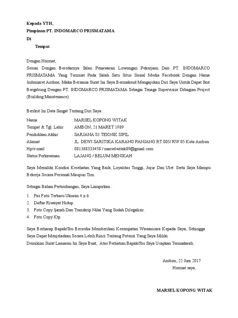 Menurut data Kemnaker, perihal tersebut selaras dengan angka lulusan yang juga selalu menumpuk setiap tahunnya. Contoh Surat Lamaran Kerja Magang - Selain Lamaran untuk bekerja, Magang juga membutuhkan surat lamaran baik itu untuk PKL SMK, Magang Mahasiswa / Guru.. INDONESIA GEOGRAFI SEJARAH SENI & BUDAYA SOSIAL UMUM..