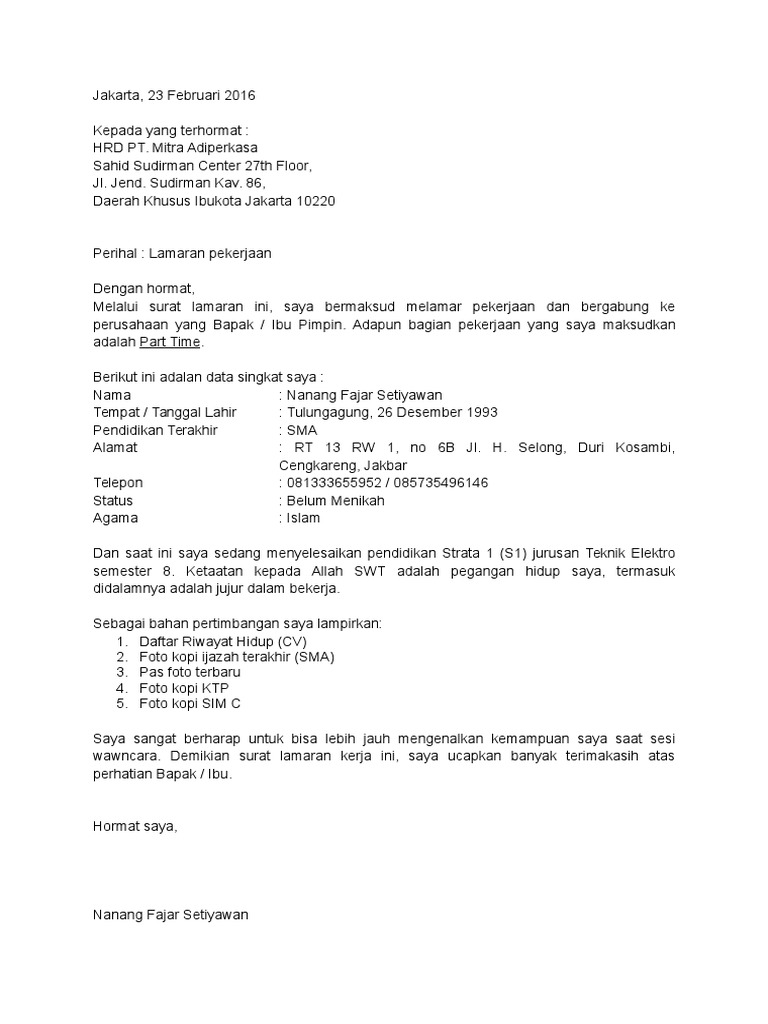 Riwayat hidup, surat lamaran dan lain sebagainya ya sobat semua. Melalui surat lamaran ini, saya bertujuan melamar kerja terhadap perusahaan yang Bapak/Ibu pimpin. Sebaiknya, hindari penggunaan kata-kata yang sulit dengan maksud agar pembaca atau perekrut terkesan dengan pilihan bahasamu. ---.