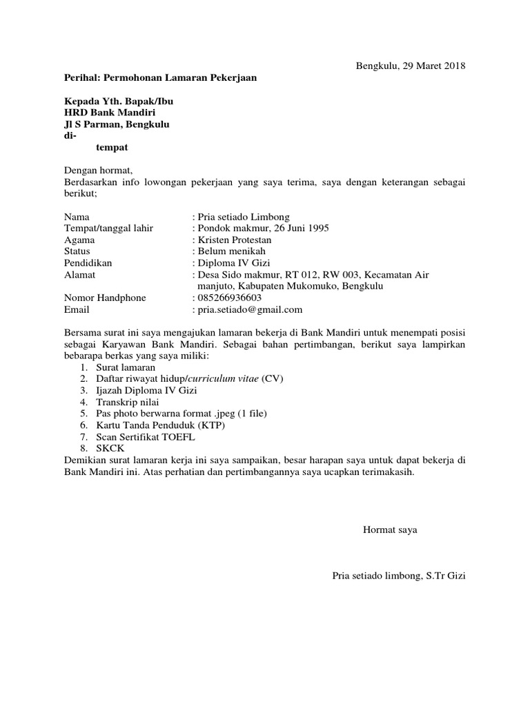 Identitas diri Menyatakan identitas diri si pembuat pernyataan secara jelas. To revisit this article, visit my profile, then view saved stories.. Menuliskan surat lamaran kerja sebaiknya singkat dan padat, tidak bertele-tele.