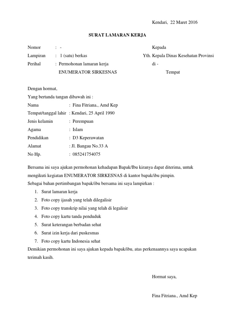 Bicara tentang surat lamaran kerja pastinya sangat luas karena saat ini banyak sekali profesi pekerjaan yang ada di dunia. Share this: Related posts: Dalam Permainan Bola Voli Terdapat Istilah Istilah Tersebut Maksudnya Adalah Pemain. Sample surat lamaran Dinas Kesehatan ini berdasarkan file pada rekrutmen pegawai dinas kesehatan Kab.