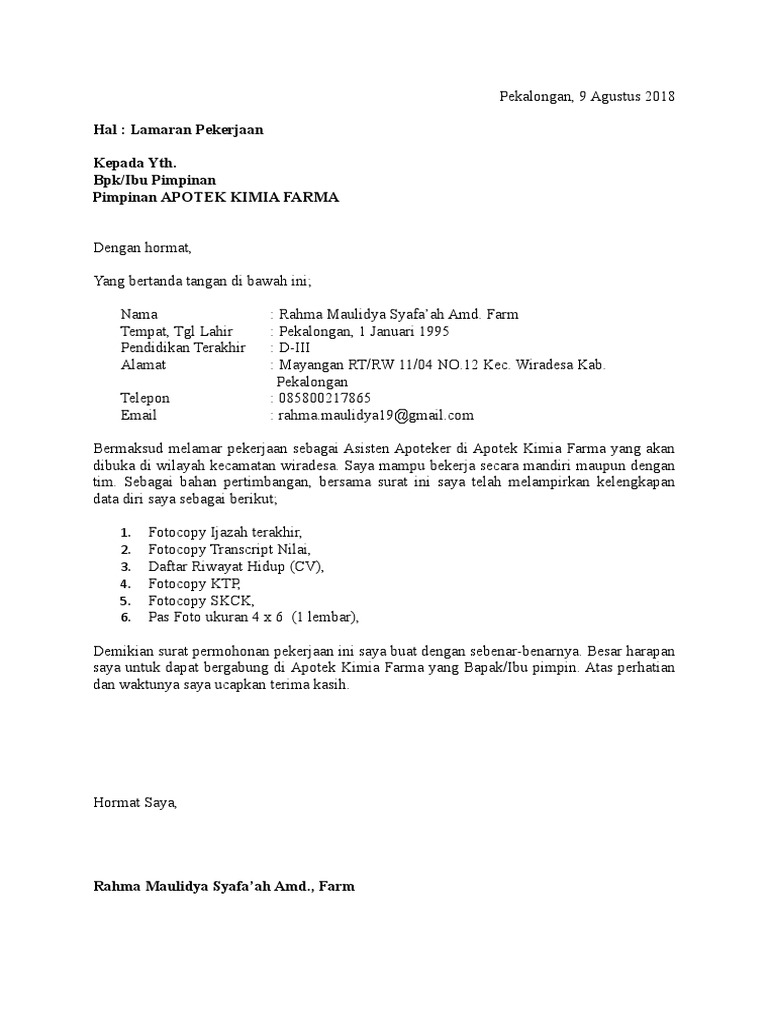 Atau apakah dokumen tersebut harus dikirim dengan format doc atau pdf. Dapatkan contoh surat lamaran kerja berbagai profesi paling lengkap. Sebagai bahan pertimbangan untuk Bapak/Ibu Pemilik Apotek Kimia Farmas, berikut saya lampirkan.