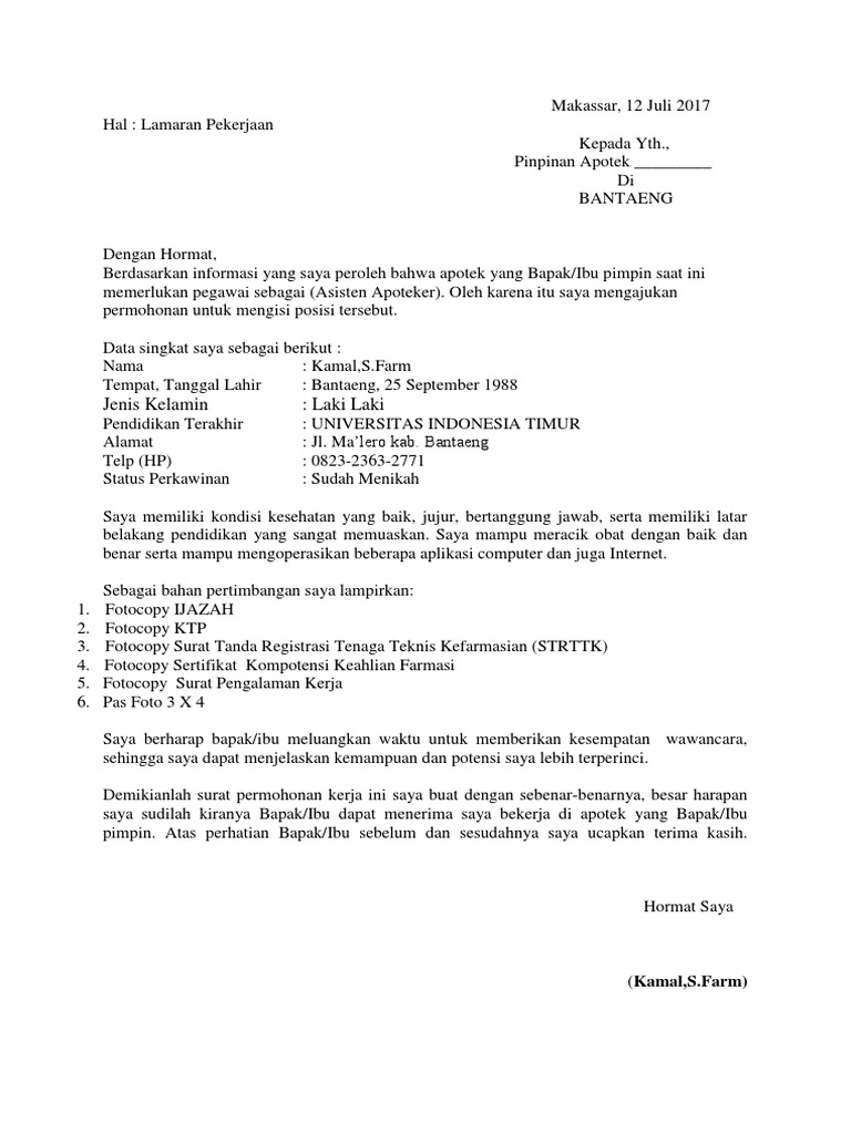 Sebagai bahan pertimbangan untuk Bapak/Ibu Pemilik Apotek Kimia Farmas, berikut saya lampirkan. contoh surat lamaran kerja asisten apoteker.