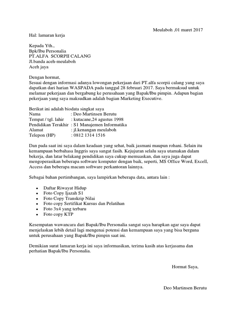 Untuk surat lamaran yang dibuat, baiknya sahabat juga menjelaskan pencapaian kerja yang sudah diraih pada perusahaan terdahulu. Ketika kamu melamar kerja sebagai karyawan di suatu PT atau kantor tertentu, tentu kamu harus melakukan hal penting dalam membuat surat lamaran kerjanya. Bagi teman-teman yang berminat silakan ajukan lamaran secepatnya.
